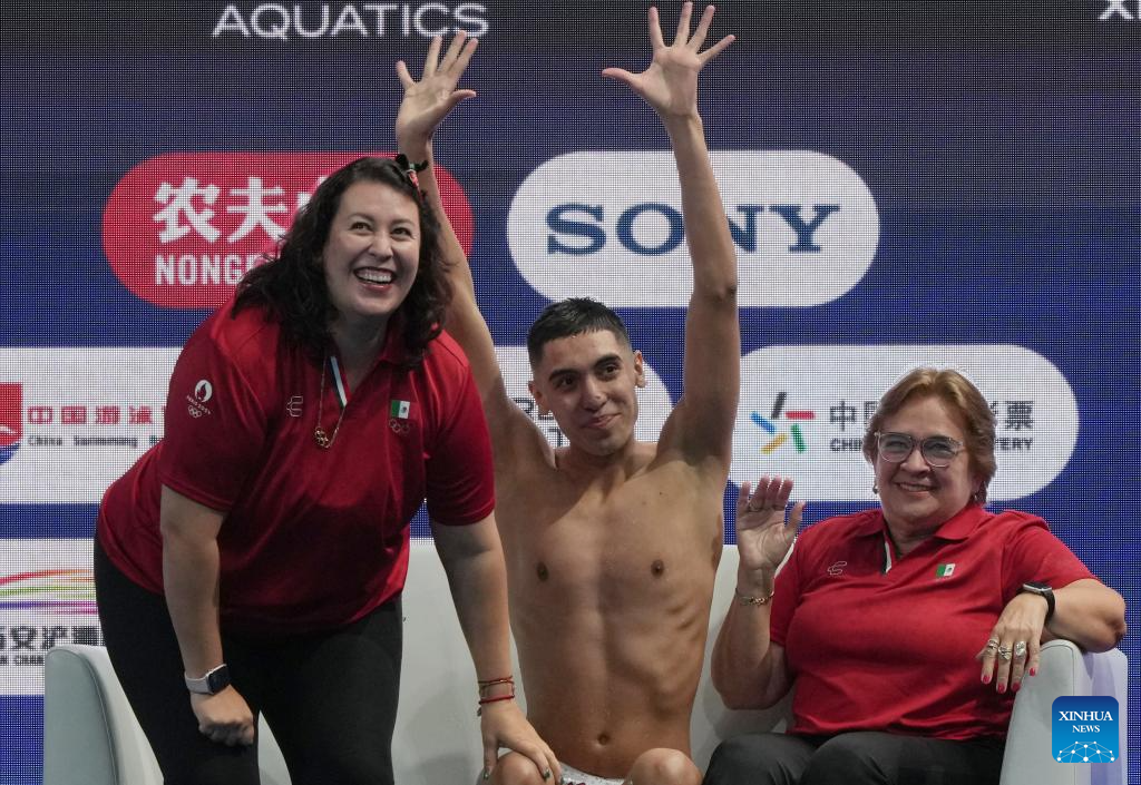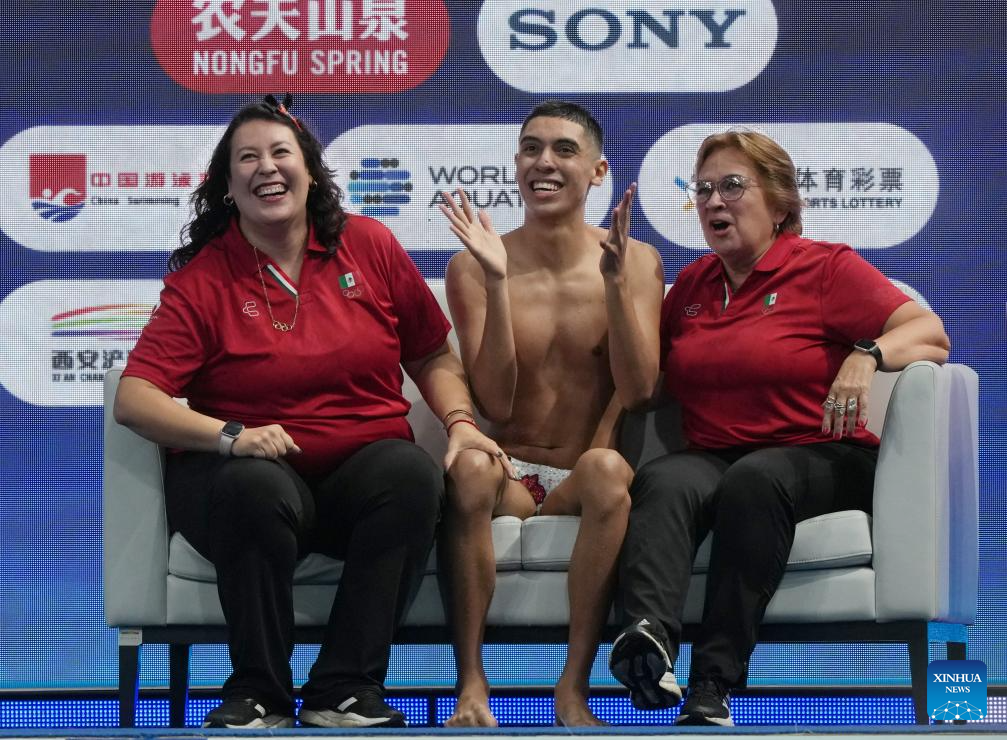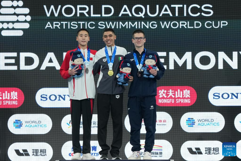 Diego Villalobos Carrillo (C) of Mexico celebrates during the men solo technical event at the World Aquatics Artistic Swimming World Cup 2025-Super Final in Xi'an, northwest China's Shaanxi Province, June 13, 2025. (Xinhua/Li Yibo)