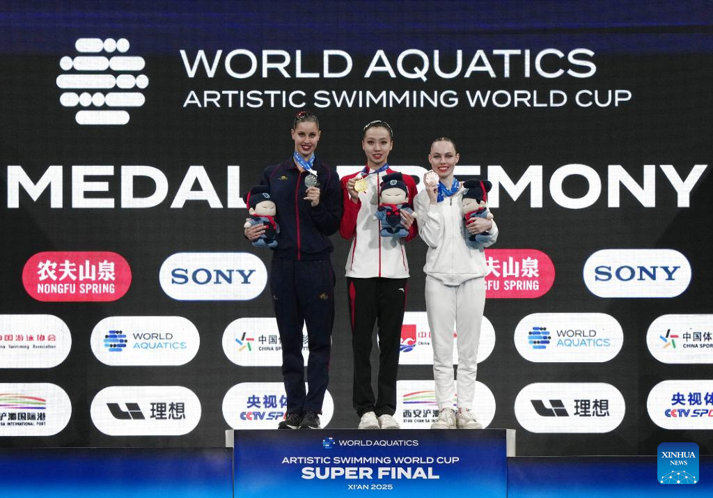 Gold medalist Xu Huiyan of China (C), silver medalist Iris Tio Casas of Spain (L) and bronze medalist Vasilina Khandoshka pose for photos during the awarding ceremony of the women solo technical event at the World Aquatics Artistic Swimming World Cup 2025-Super Final in Xi'an, northwest China's Shaanxi Province, June 13, 2025. (Xinhua/Li Yibo)