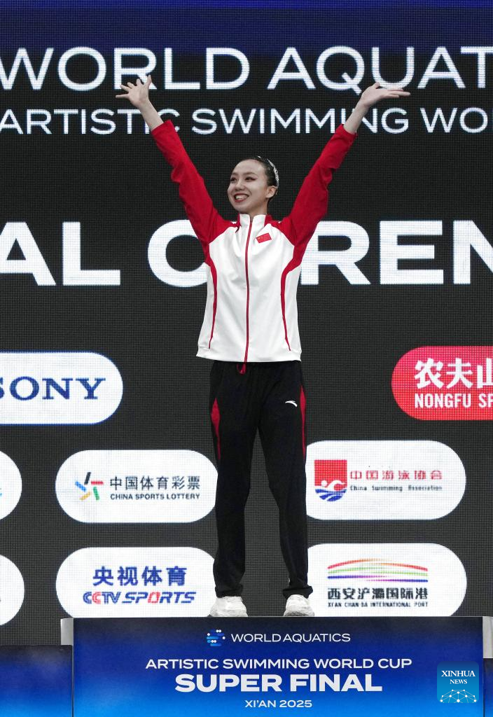 Gold medalist Xu Huiyan of China celebrates during the awarding ceremony of the women solo technical event at the World Aquatics Artistic Swimming World Cup 2025-Super Final in Xi'an, northwest China's Shaanxi Province, June 13, 2025. (Xinhua/Li Yibo)