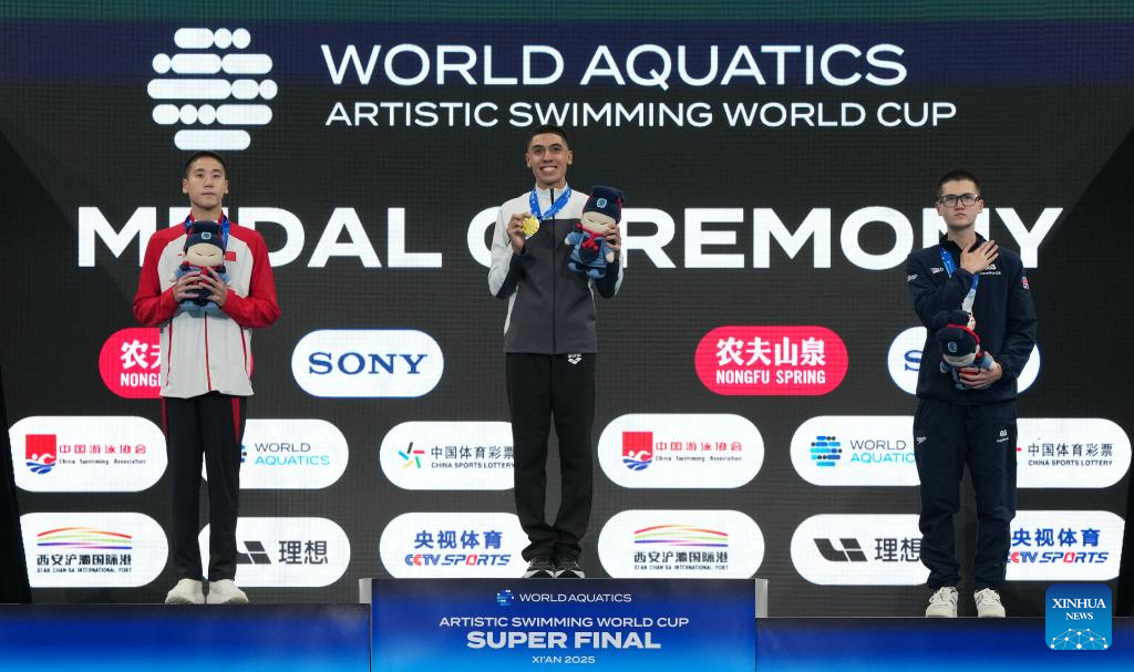 Gold medalist Diego Villalobos Carrillo (C) of Mexico, silver medalist Guo Muye (L) of China and bronze medalist Ranjuo Charles Tomblin of Britain pose during the awarding ceremony for during the men solo technical event at the World Aquatics Artistic Swimming World Cup 2025-Super Final in Xi'an, northwest China's Shaanxi Province, June 13, 2025. (Xinhua/Li Yibo)