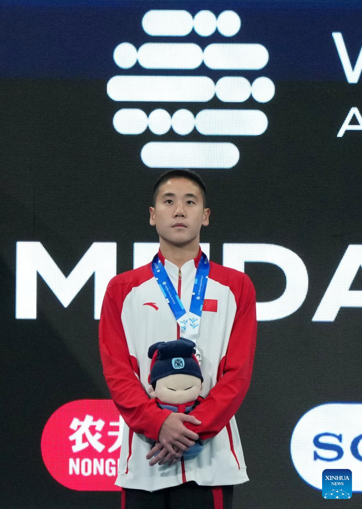 Guo Muye of China reacts during the awarding ceremony for the men solo technical event at the World Aquatics Artistic Swimming World Cup 2025-Super Final in Xi'an, northwest China's Shaanxi Province, June 13, 2025. (Xinhua/Li Yibo)