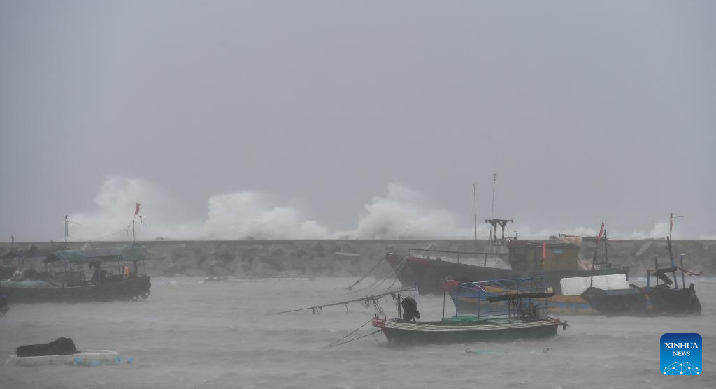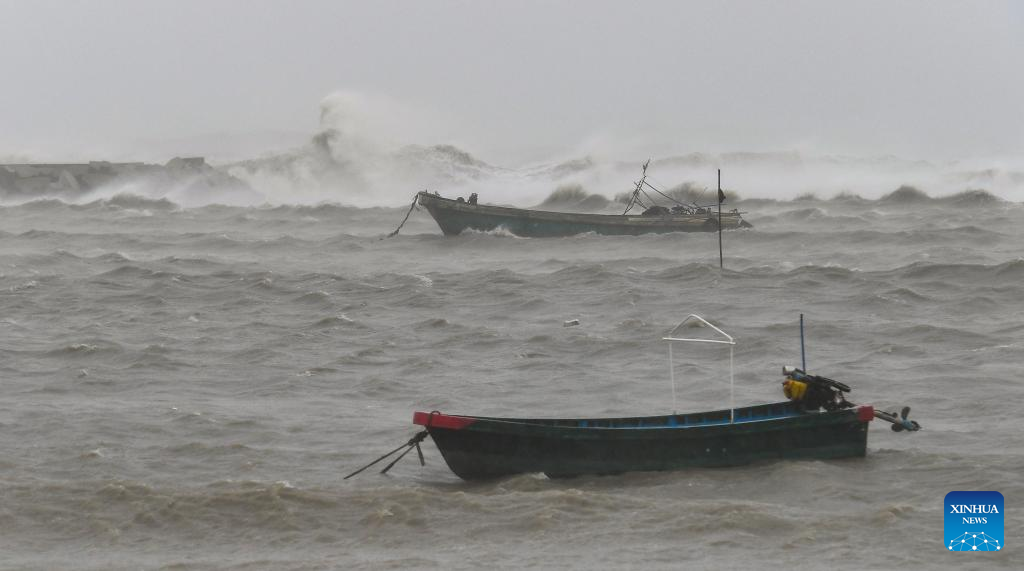Fishing boats moor to take shelter in the waters near a waterfront square in Yinggehai Town, Ledong Li Autonomous County, south China's Hainan Province, June 13, 2025. As Typhoon Wutip continued to strengthen, the Hainan provincial meteorological service maintained a Level III typhoon alert as of 11 a.m. Friday.