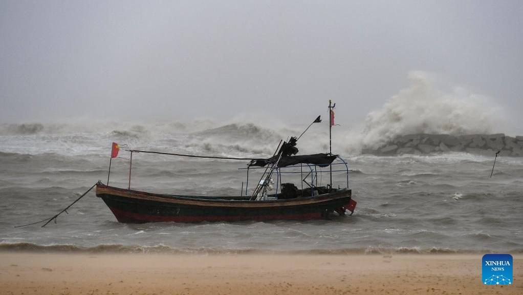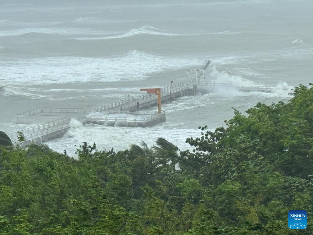 (250613) -- SANYA, June 13, 2025 (Xinhua) -- Strong winds and rough waves are seen at the Dadonghai sea area in Sanya, south China's Hainan Province, June 13, 2025. As Typhoon Wutip continued to strengthen, the Hainan provincial meteorological service maintained a Level III typhoon alert as of 11 a.m. Friday.