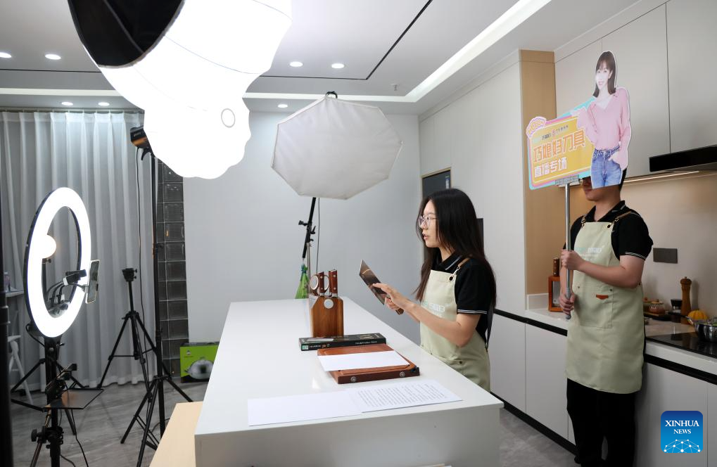 Staff members promote knives via live-streaming at a knife company in Yangjiang, south China's Guangdong Province, June 11, 2025. Yangjiang, located in south China's Guangdong, is known for its knife and scissors manufacturing. Evolving from traditional forging to intelligent manufacturing, and from original equipment manufacturing (OEM) production to building independent brand, the city's knife and scissors industry is expanding its global reach, with its products exported to over 130 countries and regions.