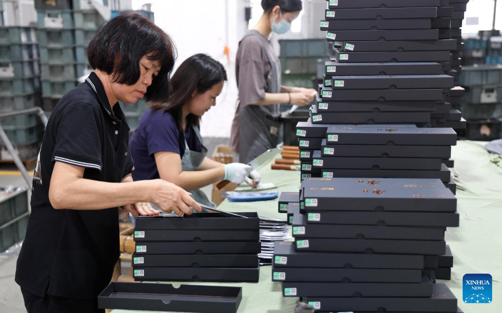 Workers pack finished knives at a factory in Yangjiang, south China's Guangdong Province, June 11, 2025. Yangjiang, located in south China's Guangdong, is known for its knife and scissors manufacturing. Evolving from traditional forging to intelligent manufacturing, and from original equipment manufacturing (OEM) production to building independent brand, the city's knife and scissors industry is expanding its global reach, with its products exported to over 130 countries and regions.