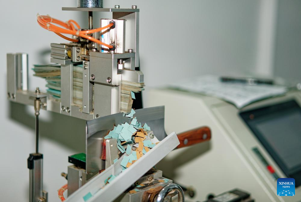A finished knife is tested for durability in a laboratory of a knife company in Yangjiang, south China's Guangdong Province, June 11, 2025. Yangjiang, located in south China's Guangdong, is known for its knife and scissors manufacturing. Evolving from traditional forging to intelligent manufacturing, and from original equipment manufacturing (OEM) production to building independent brand, the city's knife and scissors industry is expanding its global reach, with its products exported to over 130 countries and regions.