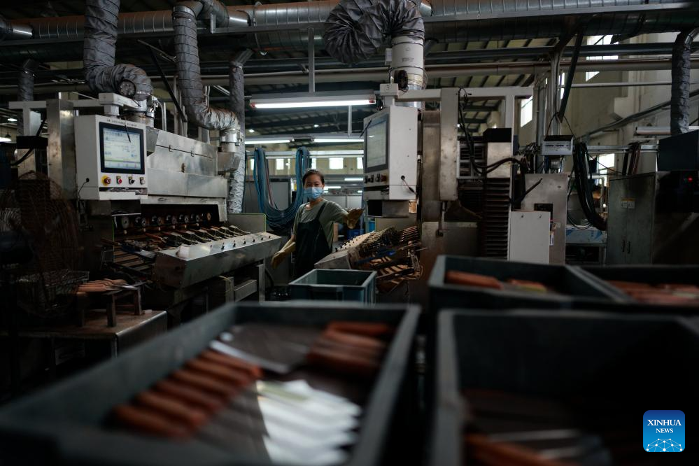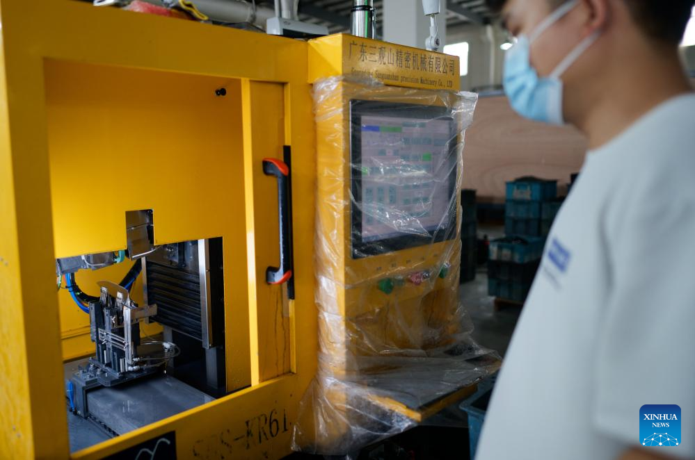 A robotic arm transfers nail clipper components onto a conveyor system at a factory in Yangjiang, south China's Guangdong Province, June 11, 2025. Yangjiang, located in south China's Guangdong, is known for its knife and scissors manufacturing. Evolving from traditional forging to intelligent manufacturing, and from original equipment manufacturing (OEM) production to building independent brand, the city's knife and scissors industry is expanding its global reach, with its products exported to over 130 countries and regions.