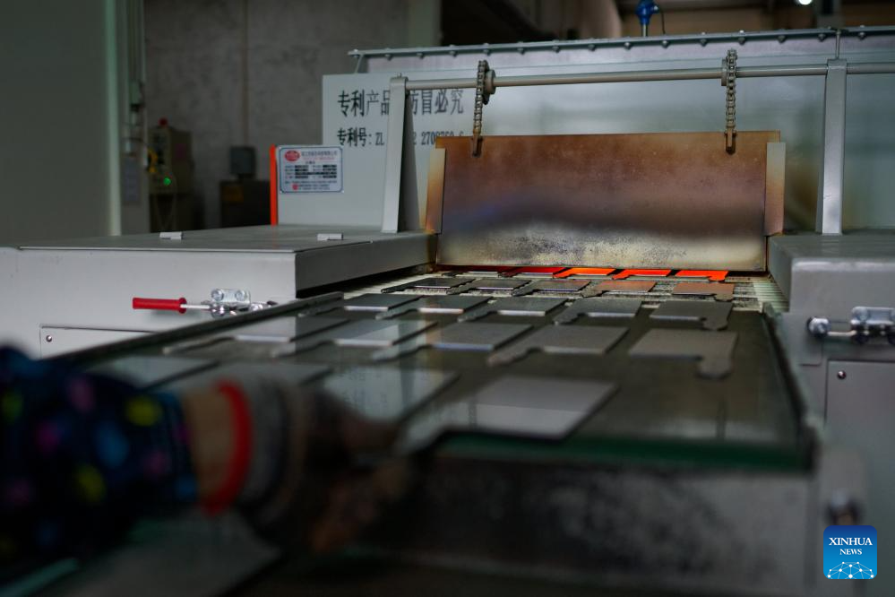 This photo taken on June 11, 2025 shows blade-shaped steel plates on an automatic heat treatment unit at a factory in Yangjiang, south China's Guangdong Province. Yangjiang, located in south China's Guangdong, is known for its knife and scissors manufacturing. Evolving from traditional forging to intelligent manufacturing, and from original equipment manufacturing (OEM) production to building independent brand, the city's knife and scissors industry is expanding its global reach, with its products exported to over 130 countries and regions.