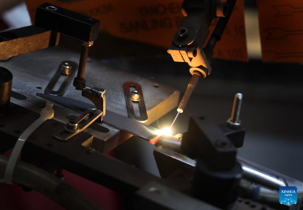 This photo taken on June 10, 2025 shows a welding machine welding a blade to a handle at a factory in Yangjiang, south China's Guangdong Province. Yangjiang, located in south China's Guangdong, is known for its knife and scissors manufacturing. Evolving from traditional forging to intelligent manufacturing, and from original equipment manufacturing (OEM) production to building independent brand, the city's knife and scissors industry is expanding its global reach, with its products exported to over 130 countries and regions.