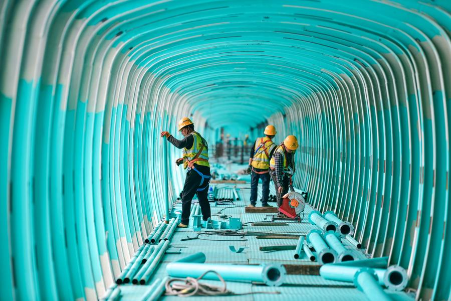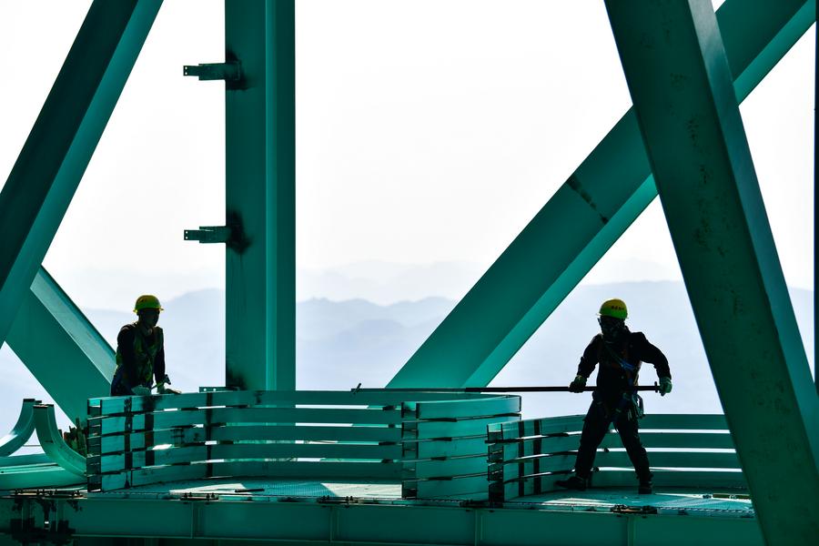 Workers build a sightseeing corridor at the construction site of the Huajiang Grand Canyon Bridge in southwest China's Guizhou Province, June 11, 2025. (Xinhua/Yang Wenbin)