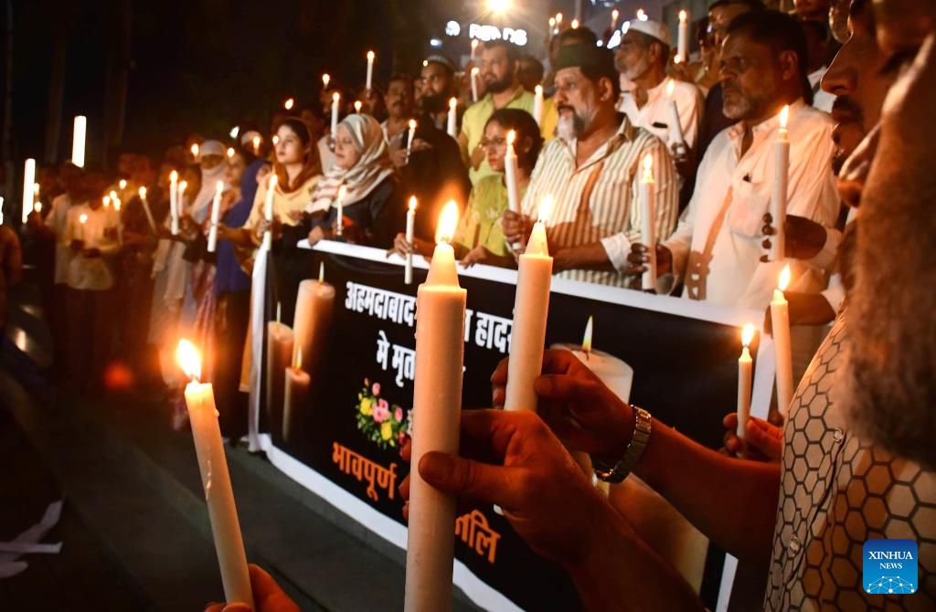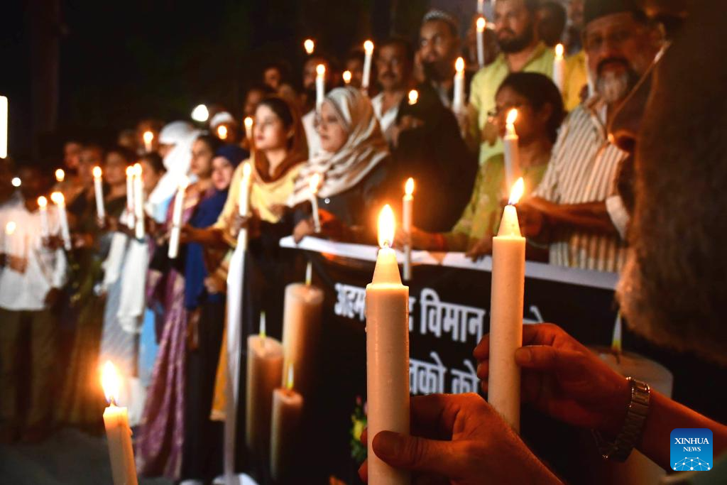 People holding lit candles mourn the victims of the Air India plane crash in Bhopal, the capital city of India's Madhya Pradesh state, June 13, 2025. According to the latest media reports, a total of 265 dead bodies had already been brought to a local government hospital in Ahmedabad city, where the plane crash had taken place.