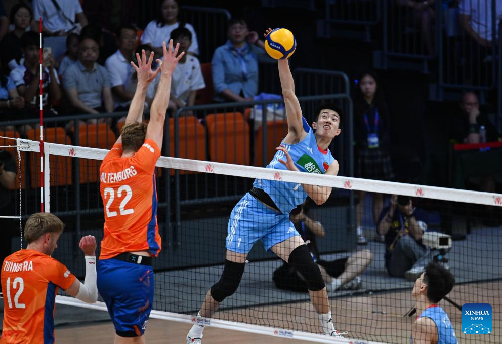 Wen Zihua of China spikes the ball during the Pool 3 match between China and the Netherlands at the Men's Volleyball Nations League (VNL) 2025 in Xi'an, northwest China's Shaanxi Province, June 14, 2025. (Xinhua/Zhang Bowen)