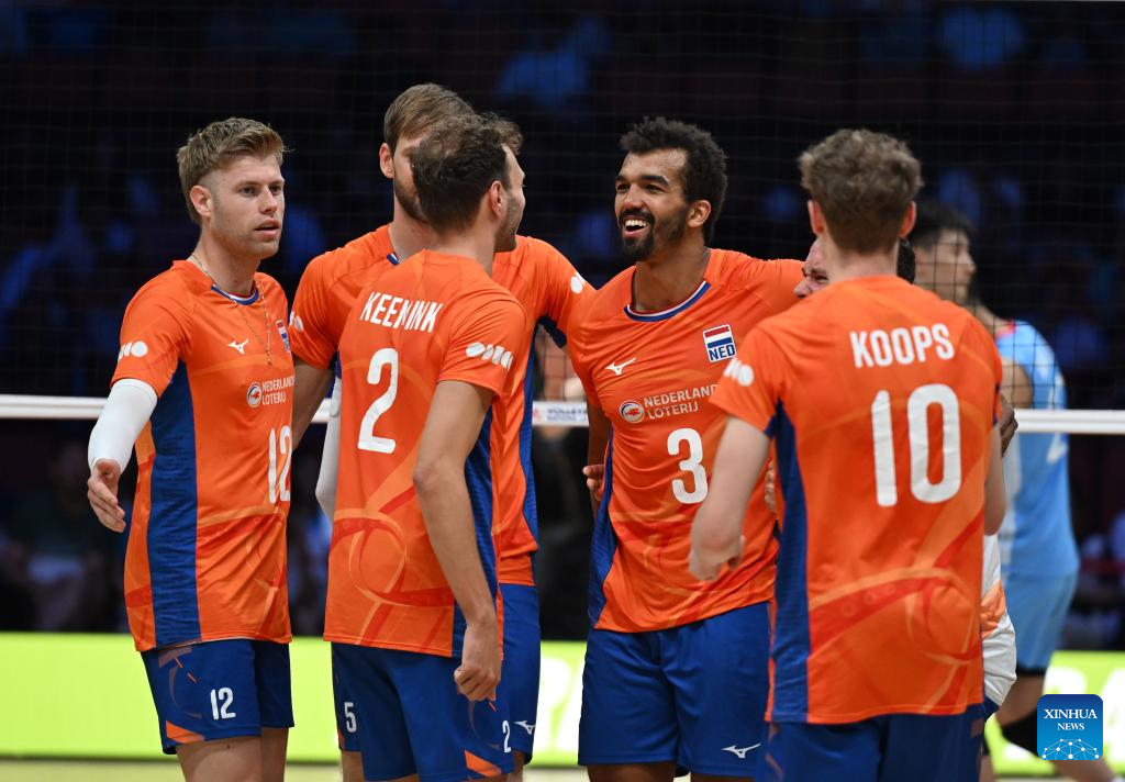 Michiel Ahyi (4th L) of the Netherlands celebrates with his teammates during the Pool 3 match between China and the Netherlands at the Men's Volleyball Nations League (VNL) 2025 in Xi'an, northwest China's Shaanxi Province, June 14, 2025. (Xinhua/Zhang Bowen)