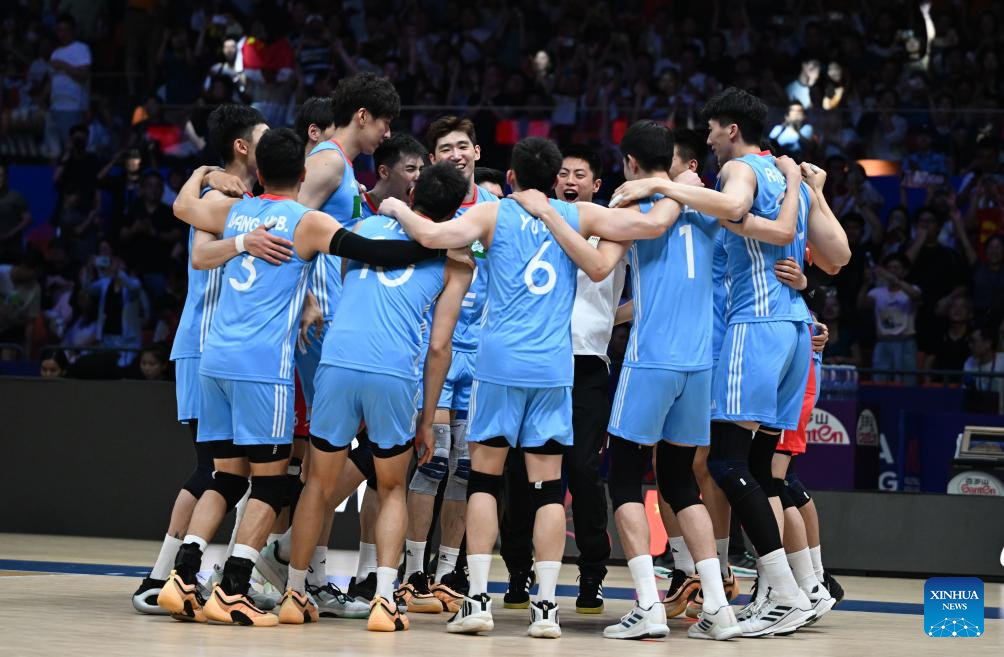 Players of China celebrate victory after the Pool 3 match between China and the Netherlands at the Men's Volleyball Nations League (VNL) 2025 in Xi'an, northwest China's Shaanxi Province, June 14, 2025. (Xinhua/Zhang Bowen)