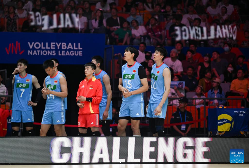 Players of China react during the Pool 3 match between China and the Netherlands at the Men's Volleyball Nations League (VNL) 2025 in Xi'an, northwest China's Shaanxi Province, June 14, 2025. (Xinhua/Zhang Bowen)