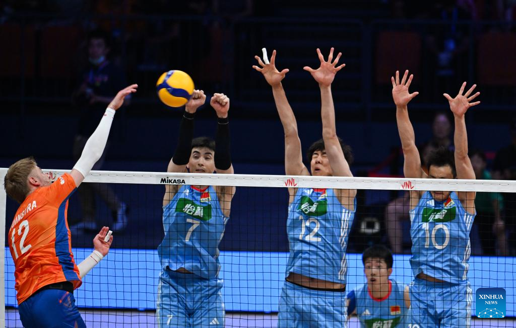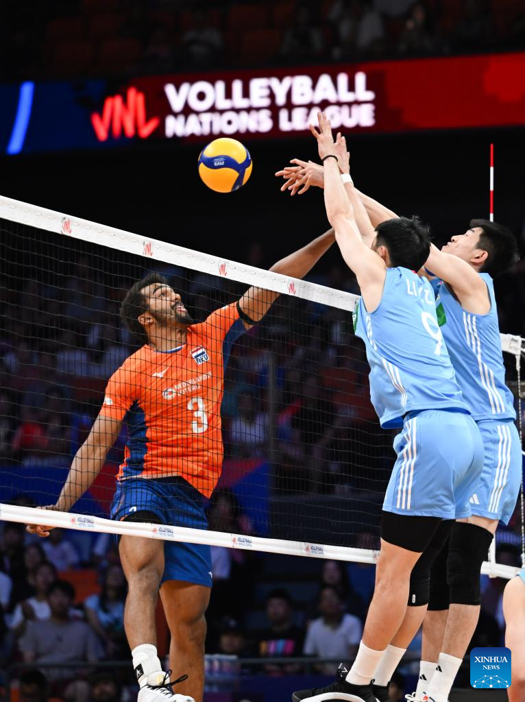 Bennie Junior Tuinstra (L) of the Netherlands spikes the ball during the Pool 3 match between China and the Netherlands at the Men's Volleyball Nations League (VNL) 2025 in Xi'an, northwest China's Shaanxi Province, June 14, 2025. (Xinhua/Zhang Bowen)