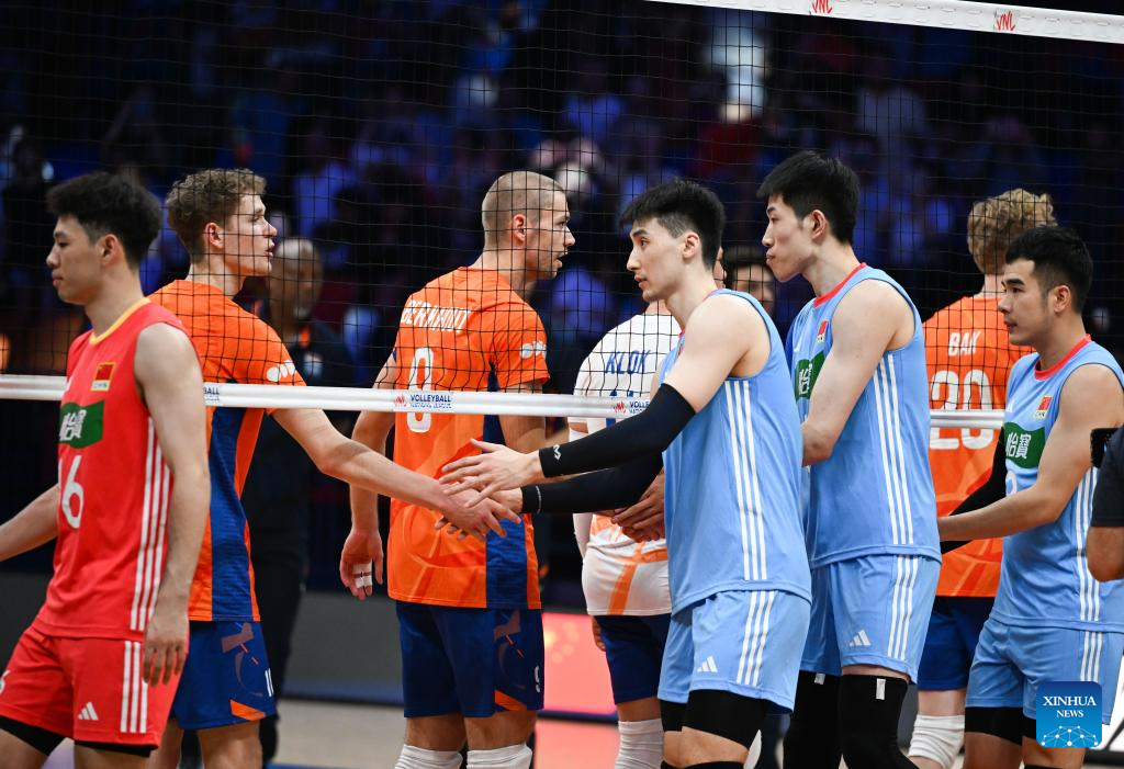 Players of China and the Netherlands greet each other after the Pool 3 match between China and the Netherlands at the Men's Volleyball Nations League (VNL) 2025 in Xi'an, northwest China's Shaanxi Province, June 14, 2025. (Xinhua/Zhang Bowen)