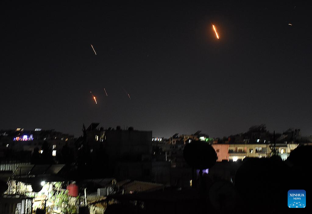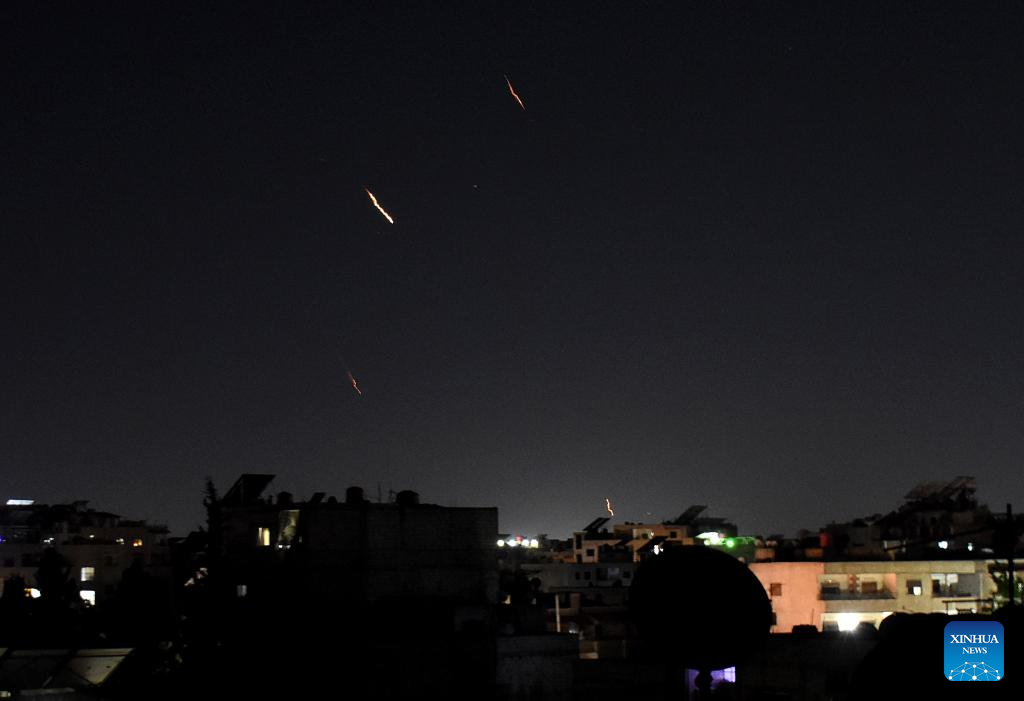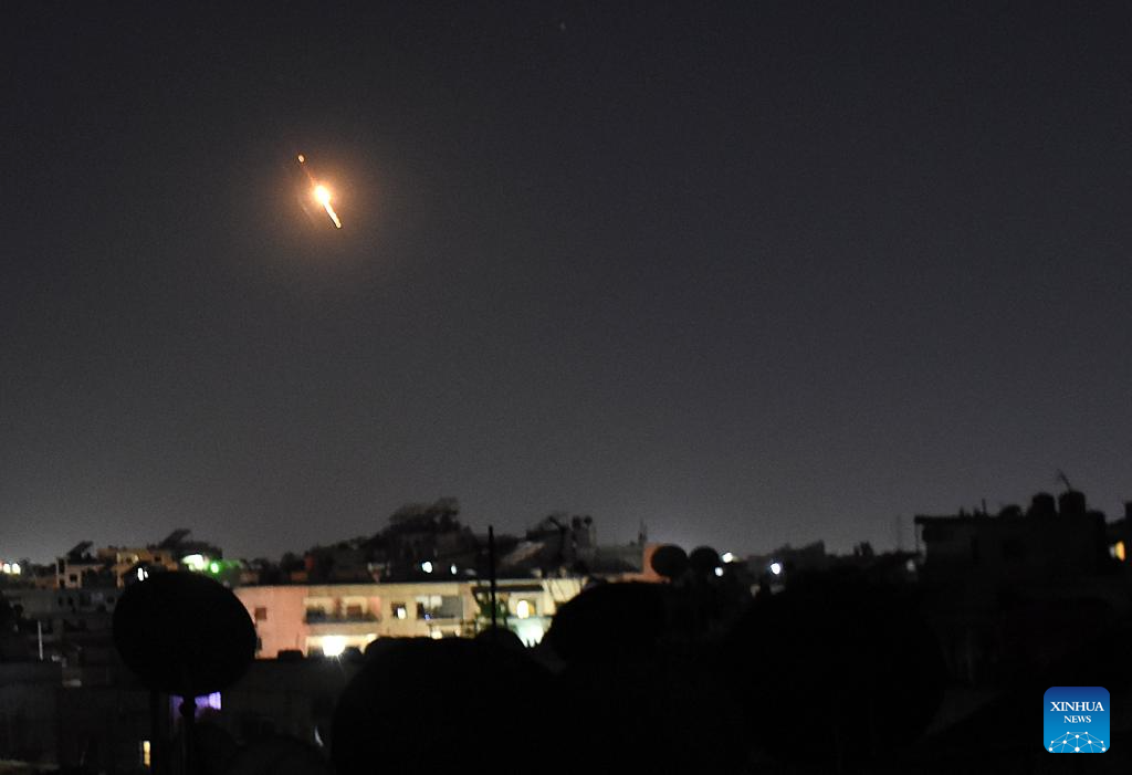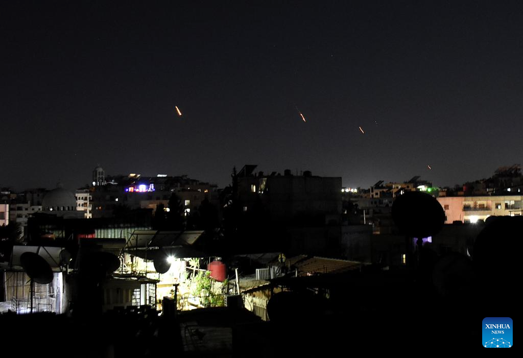 Traces of Iranian missiles heading toward Israel are seen over Damascus, Syria, on June 13, 2025. Dozens of missiles were fired from Iran into Israel on Friday evening, according to statements issued by the Israel Defense Forces (IDF). (Photo by Ammar Safarjalani/Xinhua)
