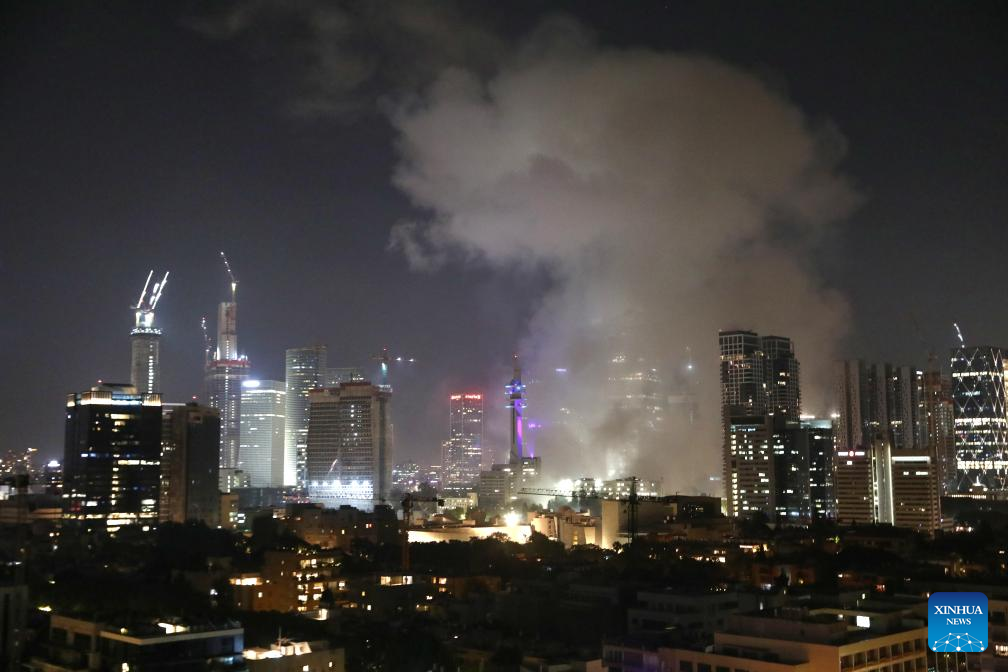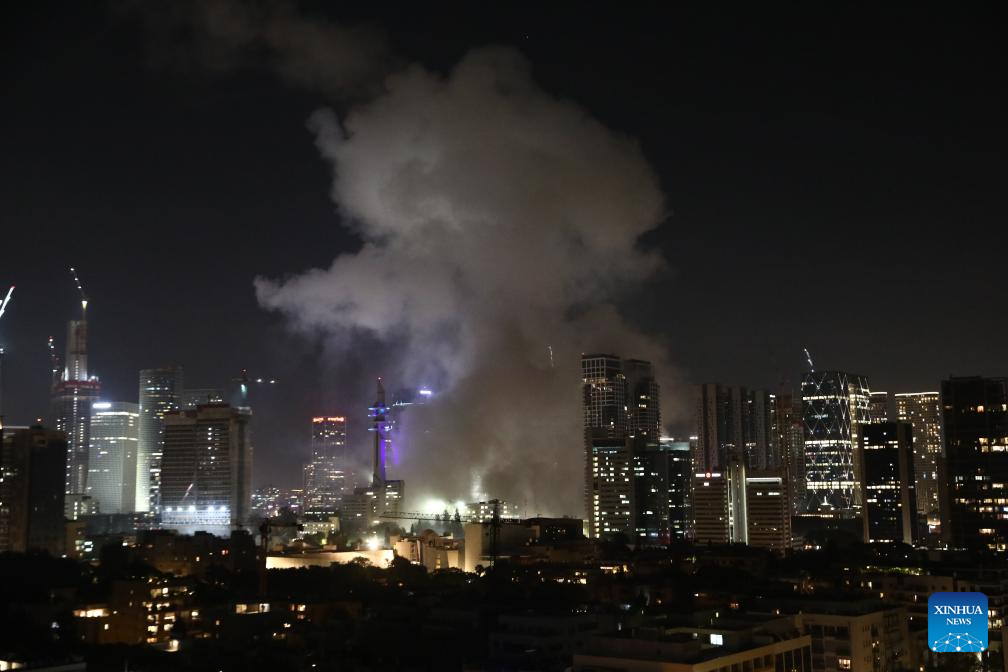 Smoke rises following an Iranian missile attack in Tel Aviv, Israel, on June 13, 2025. Dozens of missiles were fired from Iran into Israel on Friday evening, according to statements issued by the Israel Defense Forces (IDF). (Gideon Markowicz/JINI via Xinhua)