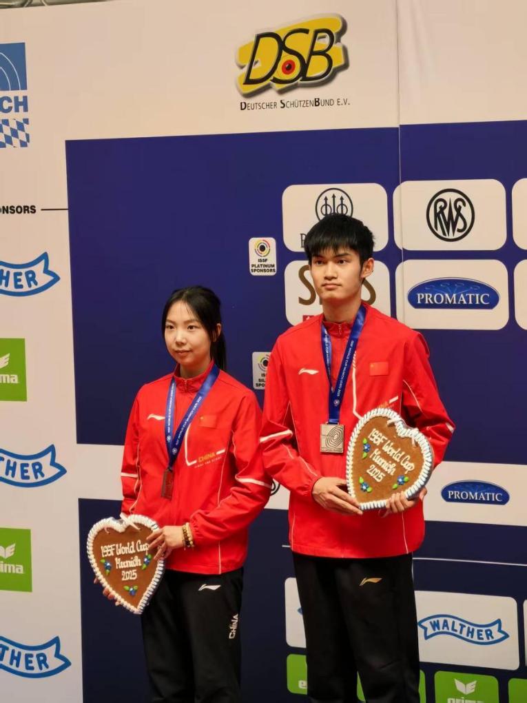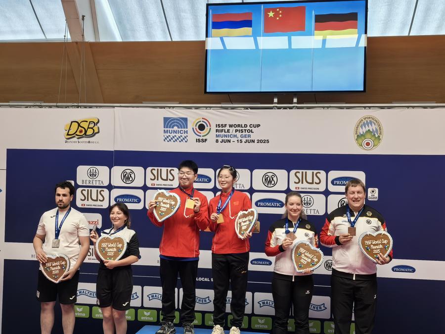 MUNICH, June 14 (Xinhua) -- Chinese shooters Yao Qianxun and Hu Kai clinched the 10m air pistol mixed team gold medal, while Wang Zifei and Sheng Lihao added a silver in the 10m air rifle mixed team as the ISSF World Cup Munich leg concluded on Friday.