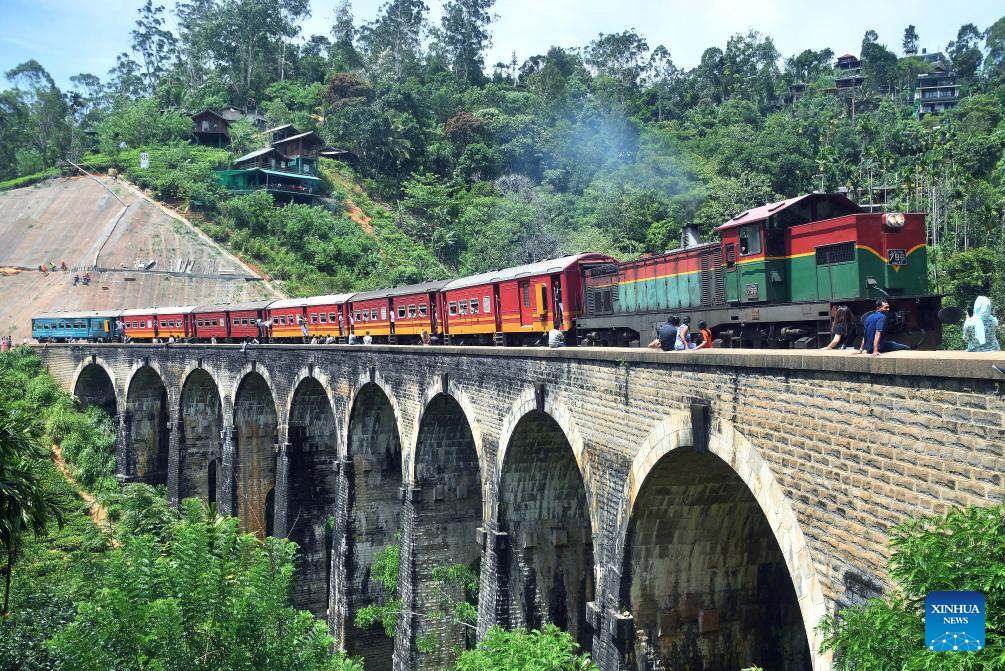 This photo taken on June 13, 2025 shows a train running on a nine-arch railway bridge built during the colonial era, in Ella, Sri Lanka. (Photo by Ajith Perera/Xinhua)