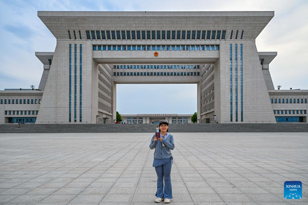 Car transporter Gao Yun poses for photos with her passport in front of the new national gate in Horgos, northwest China's Xinjiang Ugyur Autonomous Region, June 10, 2025. (Xinhua/Chen Shuo)