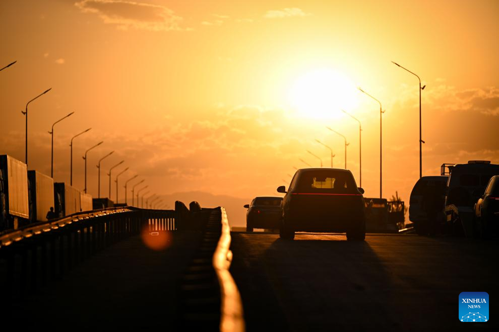 Commercial vehicles wait in line for export at the road port of Horgos in Horgos, northwest China's Xinjiang Ugyur Autonomous Region, in the early morning on June 11, 2025. (Xinhua/Chen Shuo)