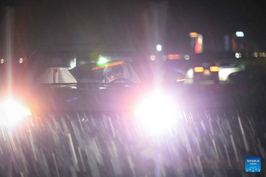 Car transporter Gao Yun, driving an exported vehicle in the rain, arrives at a parking lot in the town of Zharkent, Kazakhstan, May 23, 2025. (Xinhua/Li Renzi)