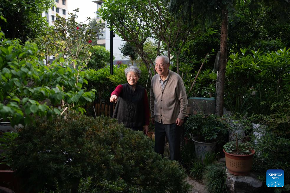 Cheng Jiyue (R), an expert on Hui-style architecture, and his wife Tong Jianying are pictured in a courtyard at home in Tunxi District of Huangshan City, east China's Anhui Province, on April 10, 2025. (Xinhua/Zhang Duan)