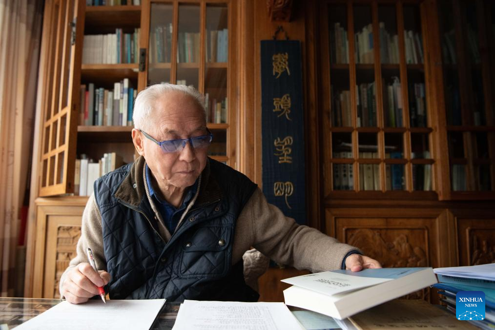 Cheng Jiyue, an expert on Hui-style architecture, writes about traditional Huizhou architecture at home in Tunxi District of Huangshan City, east China's Anhui Province, on April 2, 2025. (Xinhua/Zhang Duan)