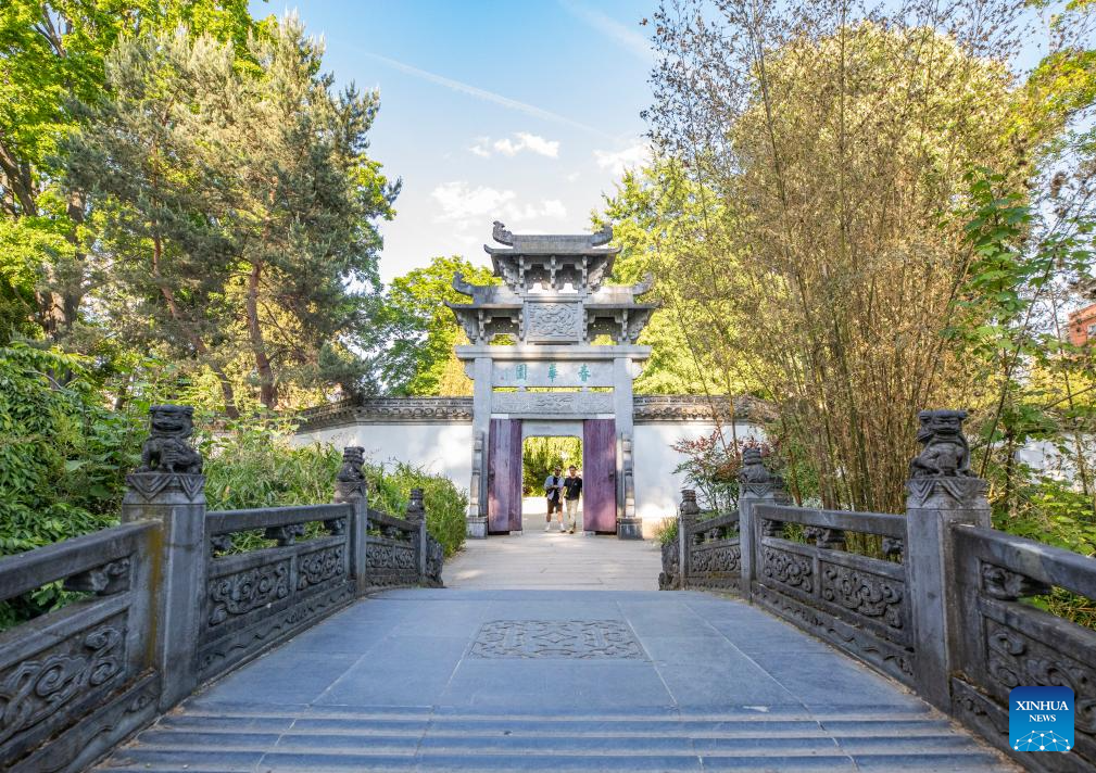 Tourists walk into Chunhua Garden in Frankfurt, Germany, on May 11, 2025. (Xinhua/Zhang Fan)
