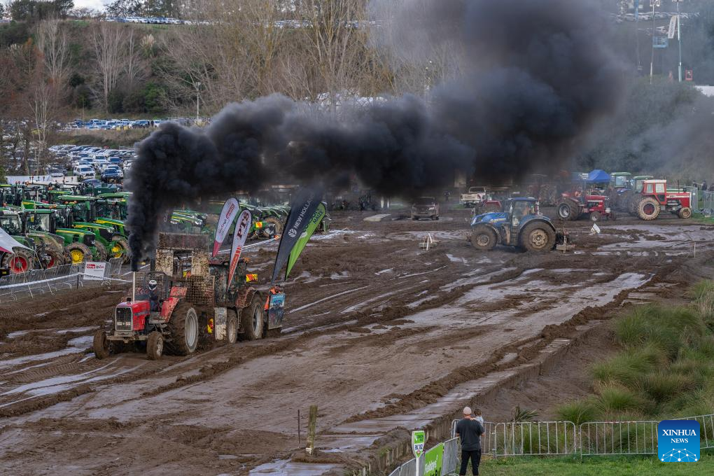 This photo taken on June 14, 2025 shows a scene of a tractor competition held at the 57th Fieldays in Hamilton, New Zealand. The 57th Fieldays, the Southern Hemisphere's largest agricultural event, concluded here on Saturday. This year's event, which began on Wednesday, has seen a record number of exhibitors, highlighting advancements in agritech, sustainability, and rural wellbeing. (Photo by Wu Jiaxiang/Xinhua)
