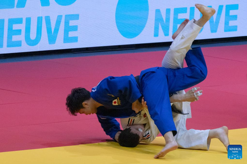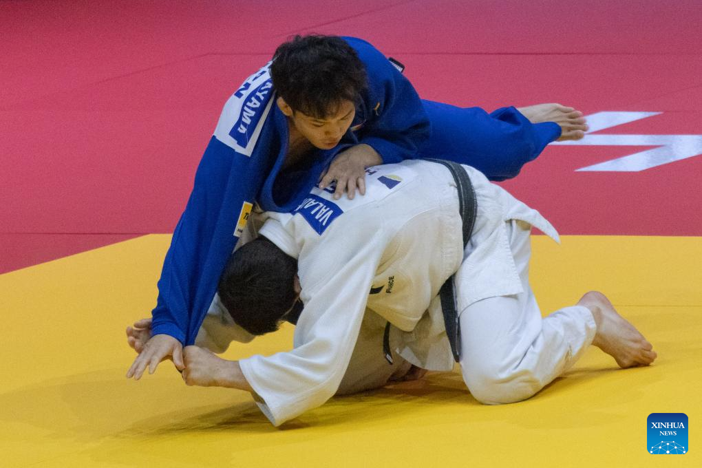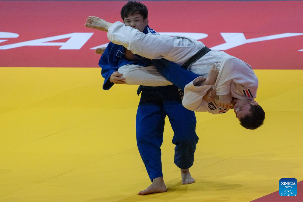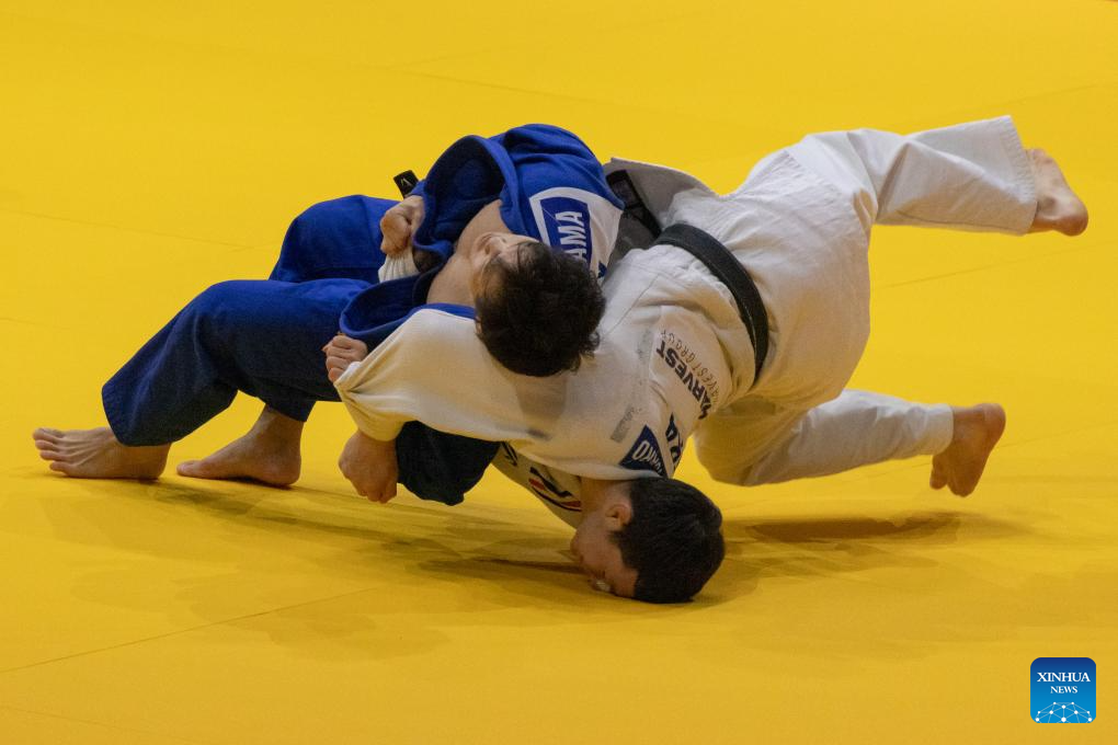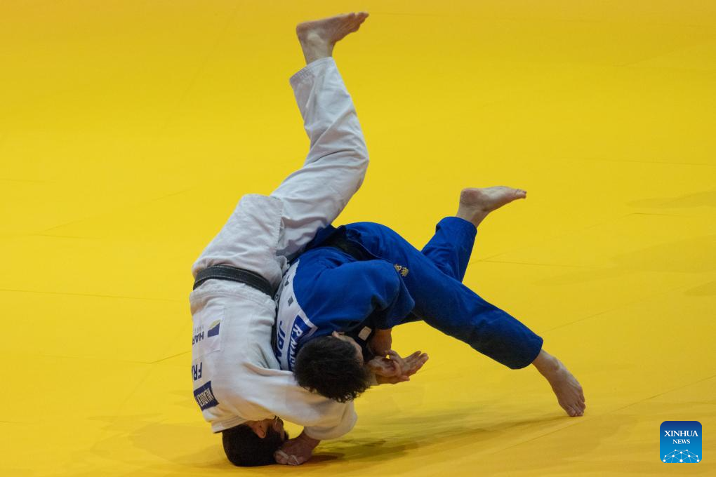 Nagayama Ryuju (L) of Japan and Romain Valadier Picard of France compete during the Men's -60 kg final of the IJF Judo World Championships 2025 in Budapest, Hungary, June 13, 2025. (Photo by Attila Volgyi/Xinhua)