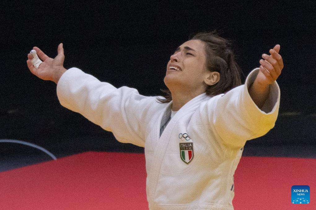 Assunta Scutto (R) of Italy celebrates victory after the Women's -48kg final of the IJF Judo World Championships 2025 in Budapest, Hungary, June 13, 2025. (Photo by Attila Volgyi/Xinhua)