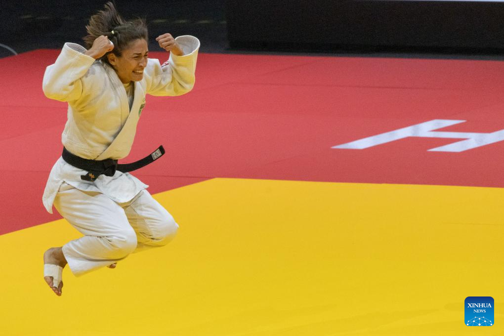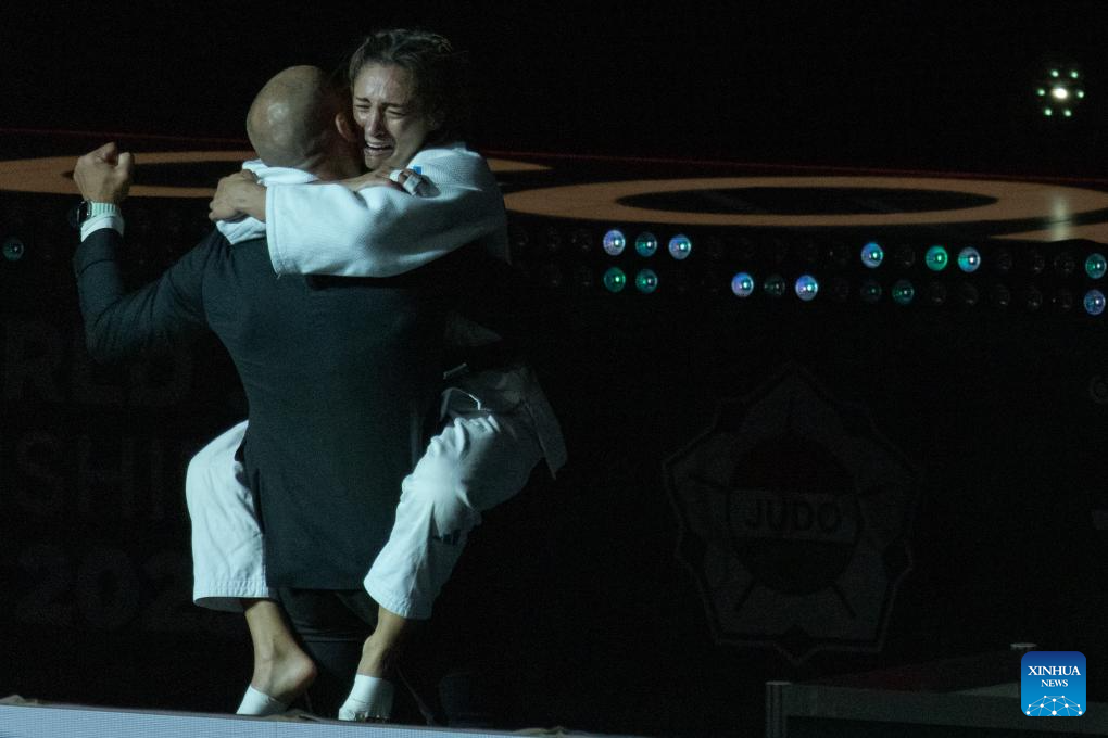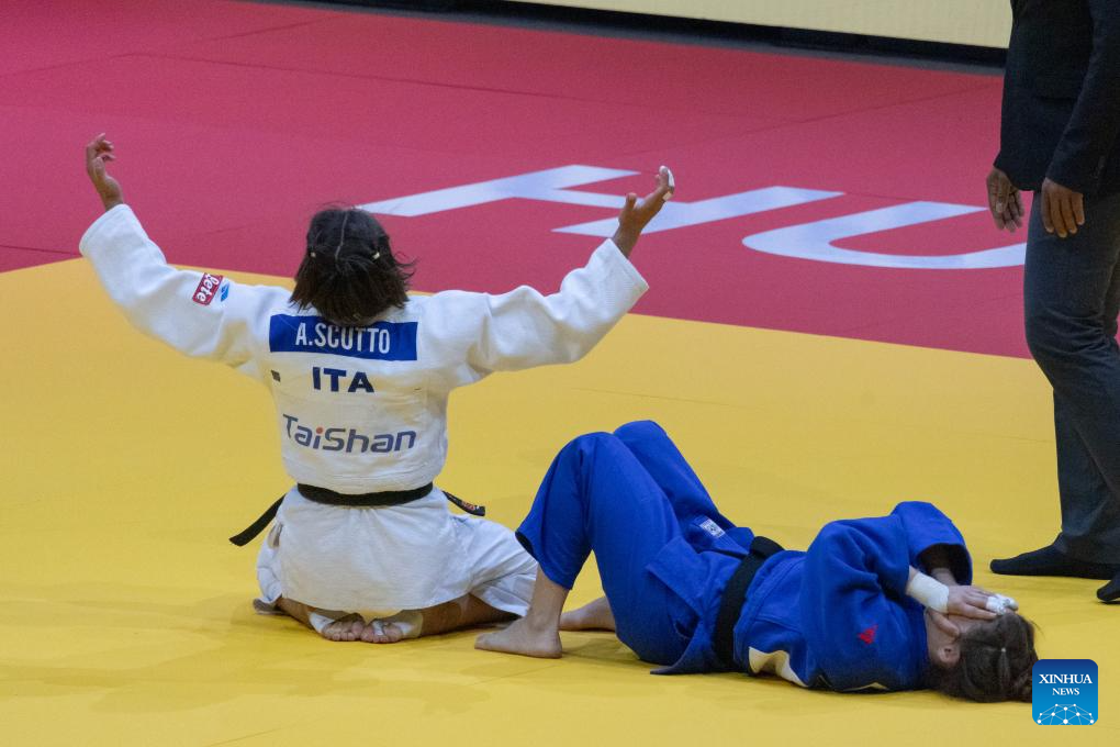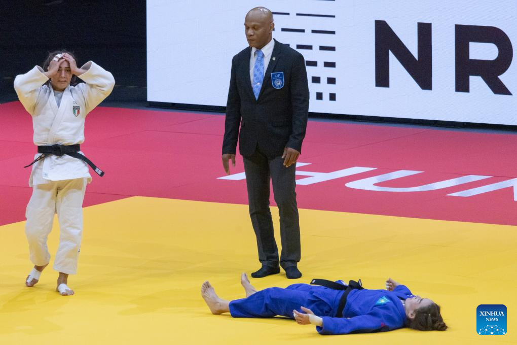 Assunta Scutto (L) of Italy celebrates after defeating Abiba Abuzhakynova of Kazakhstan during the Women's -48kg final of the IJF Judo World Championships 2025 in Budapest, Hungary, June 13, 2025. (Photo by Attila Volgyi/Xinhua)