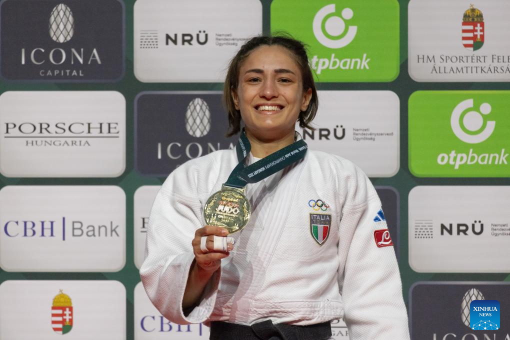 Assunta Scutto of Italy celebrates during the awarding ceremony after the Women's -48kg final of the IJF Judo World Championships 2025 in Budapest, Hungary, June 13, 2025. (Photo by Attila Volgyi/Xinhua)