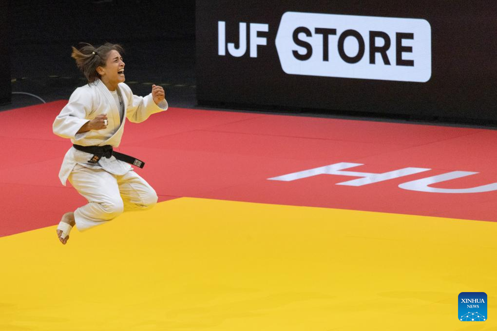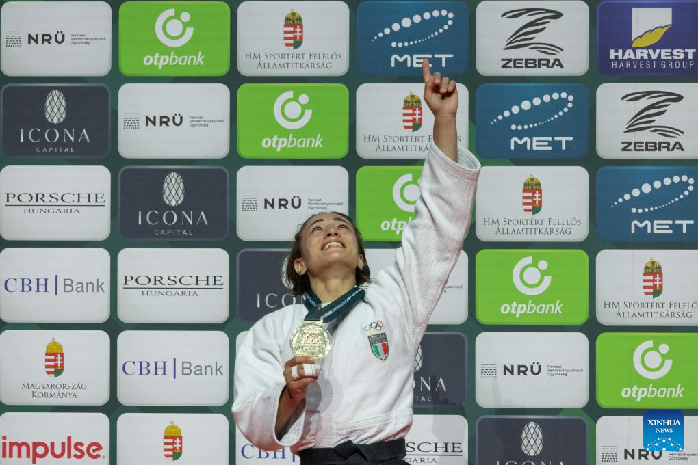 Assunta Scutto of Italy celebrates after defeating Abiba Abuzhakynova of Kazakhstan during the Women's -48kg final of the IJF Judo World Championships 2025 in Budapest, Hungary, June 13, 2025. (Photo by Attila Volgyi/Xinhua)