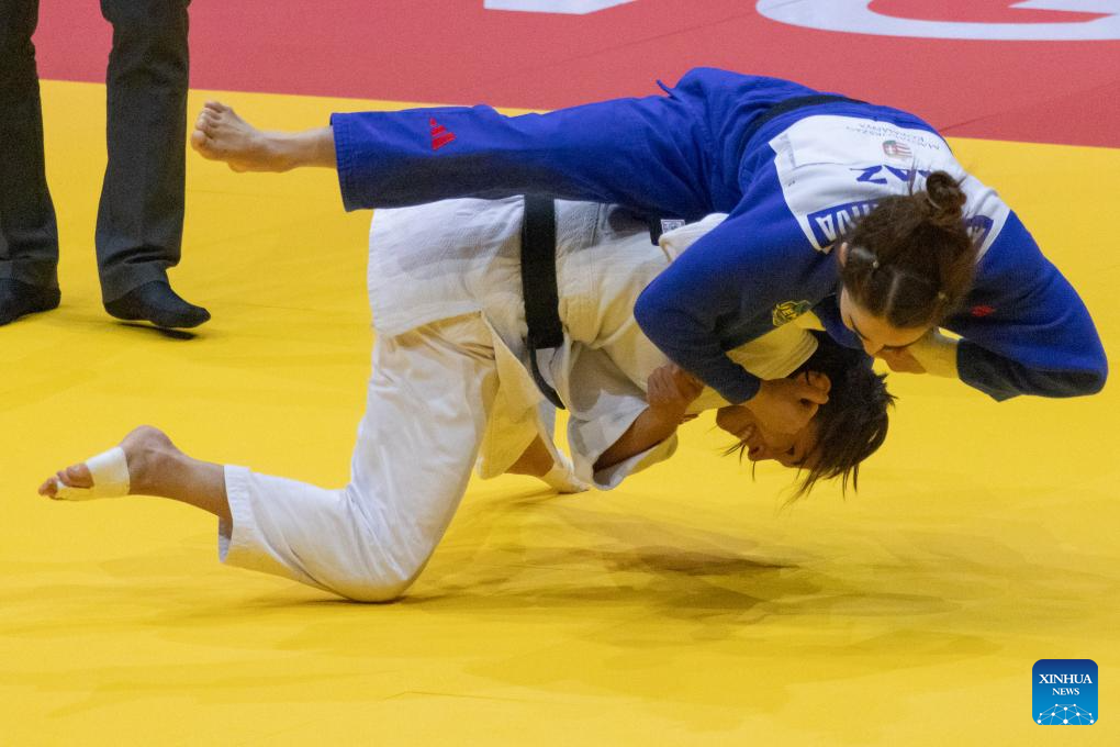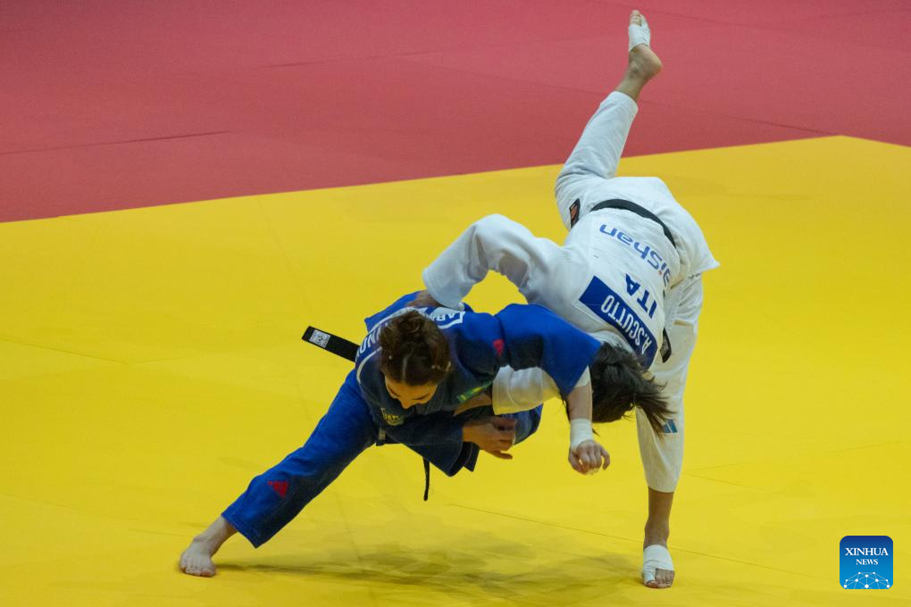 Assunta Scutto (bottom) of Italy and Abiba Abuzhakynova of Kazakhstan compete during the Women's -48kg final of the IJF Judo World Championships 2025 in Budapest, Hungary, June 13, 2025. (Photo by Attila Volgyi/Xinhua)