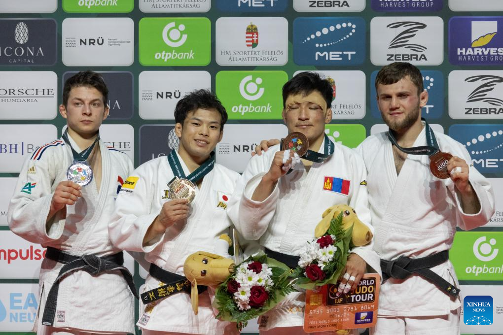 Silver medalist Romain Valadier Picard (1st L) of France, gold medalist Ryuju Nagayama (2nd L) of Japan, bronze medalists Yolk Kazirbyek (2nd R) of Mongolia and Ayub Bliev pose during the awarding ceremony after the Men's -60 kg final of the IJF Judo World Championships 2025 in Budapest, Hungary, June 13, 2025. (Photo by Attila Volgyi/Xinhua)