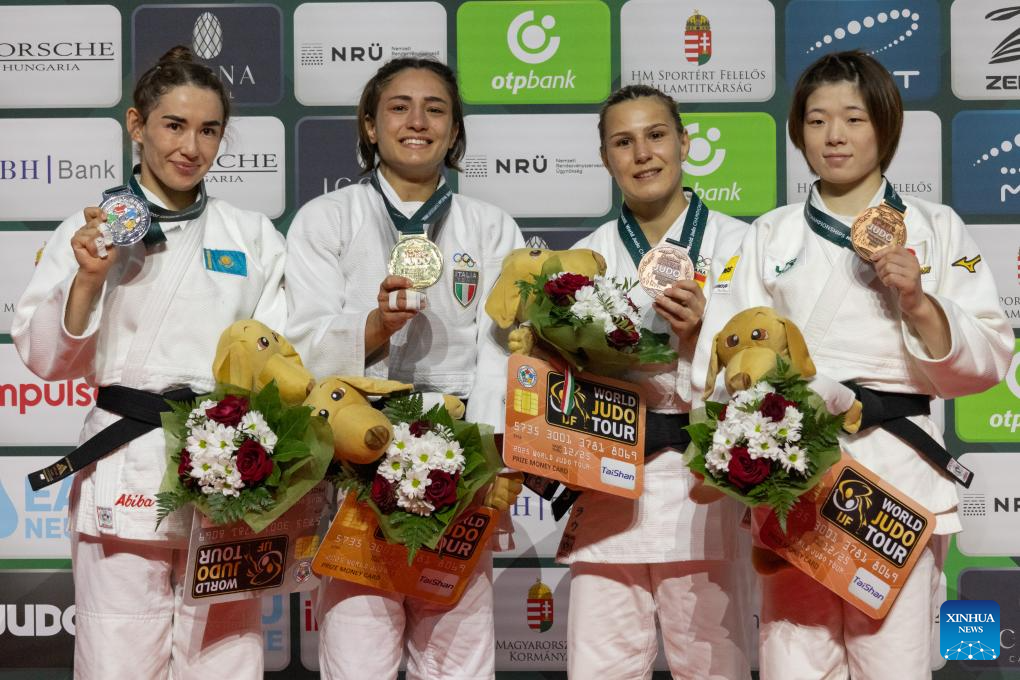 Silver medalist Abiba Abuzhakynova (1st L) of Kazakhstan, gold medalist Assunta Scutto (2nd L) of Italy, bronze medalists Laura Martinez Abelenda (2nd R) of Spain and Wakana Kog of Japan pose during the awarding ceremony after the Women's -48kg final of the IJF Judo World Championships 2025 in Budapest, Hungary, June 13, 2025. (Photo by Attila Volgyi/Xinhua)