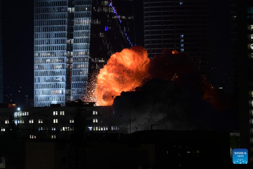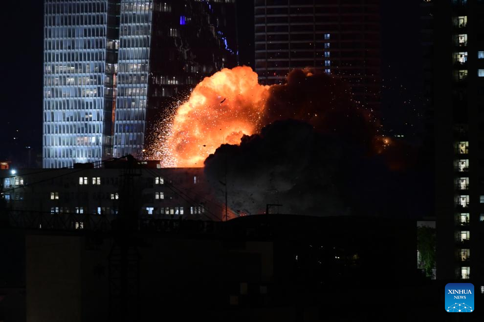 A building is hit by a missile in Tel Aviv, Israel, on June 13, 2025. Nearly 100 missiles were launched from Iran toward central and northern Israel in two massive barrages, causing significant damage and injuring 41 people, according to the Israeli military and the national emergency service, Magen David Adom (MDA). (Tomer Neuberg/JINI via Xinhua)