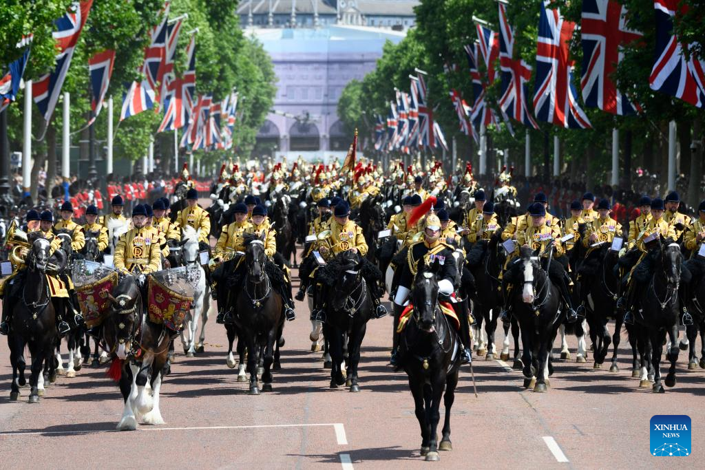 Members of the Household Division march during the Trooping the Colour parade to honour Britain's King Charles III on his official birthday in London, Britain, June 14, 2025. (Photo by Ray Tang/Xinhua)