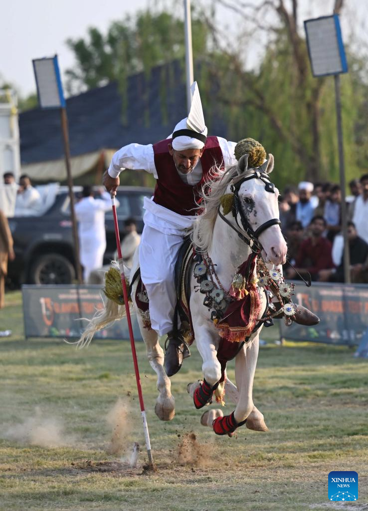 In tent pegging, a horseman gallops and uses a sword or a lance to pierce, pick up and carry away a wooden peg. (Xinhua/Ahmad Kamal)