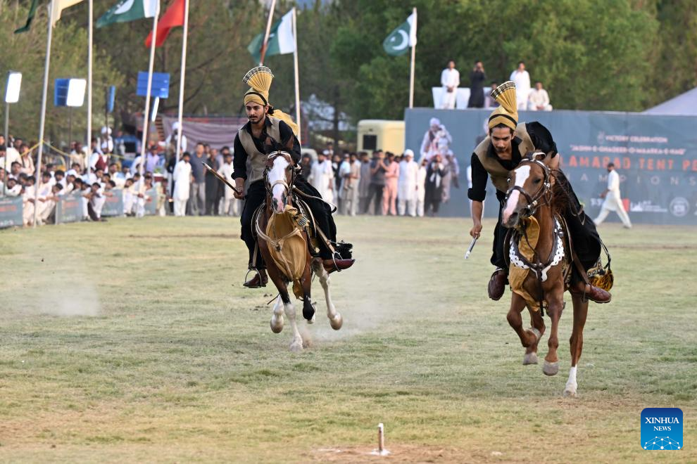 Horsemen compete during a tent pegging competition in Islamabad, capital of Pakistan on June 14, 2025.