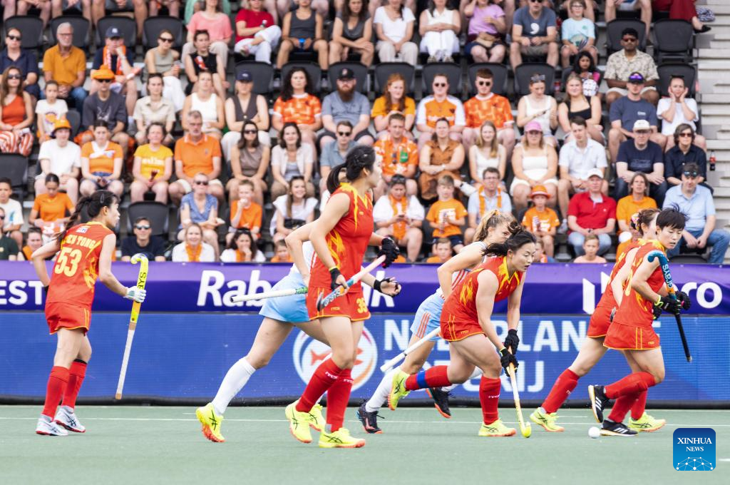 Ou Zixia (3rd R) of China vies for the ball during the FIH Hockey Pro League women's match between China and the Netherlands in Amstelveen, the Netherlands, June 14, 2025. (Photo by Sylvia Lederer/Xinhua)