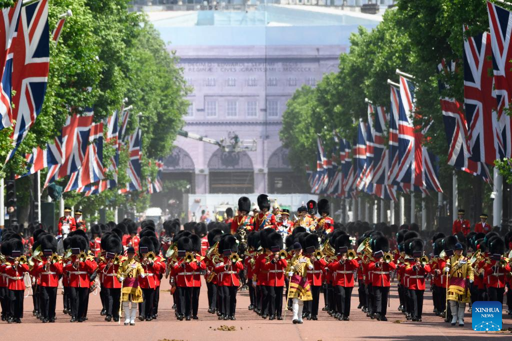 Britain's King Charles III and Queen Camilla attend the Trooping the Colour parade to honour Britain's King Charles III on his official birthday in London, Britain, on June 14, 2025. (Photo by Ray Tang/Xinhua)