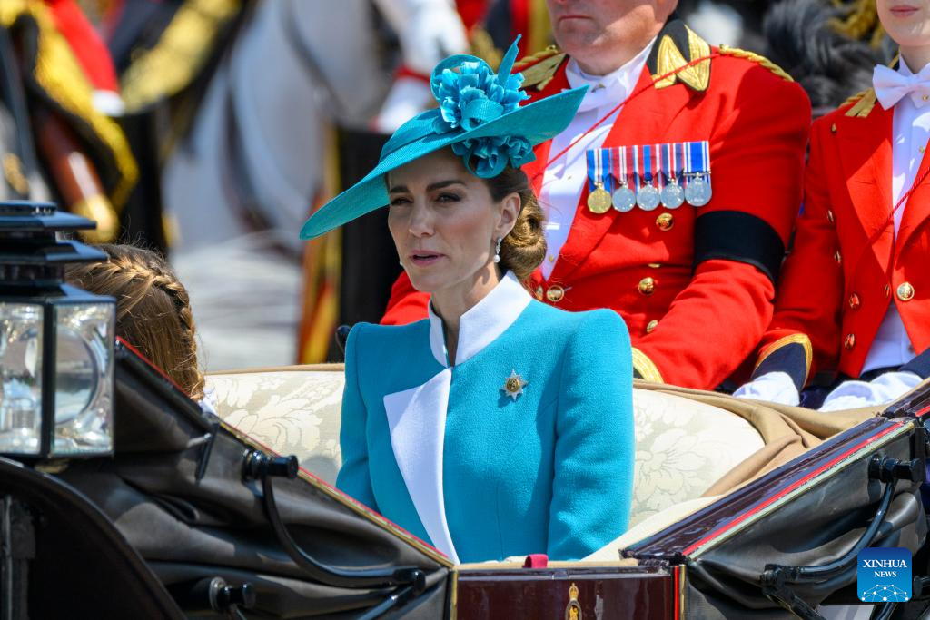 Britain's Catherine, Princess of Wales, rides a royal carriage with Prince George, Princess Charlotte and Prince Louis, during the Trooping the Colour parade to honour Britain's King Charles III on his official birthday in London, Britain, on June 14, 2025. (Photo by Ray Tang/Xinhua)