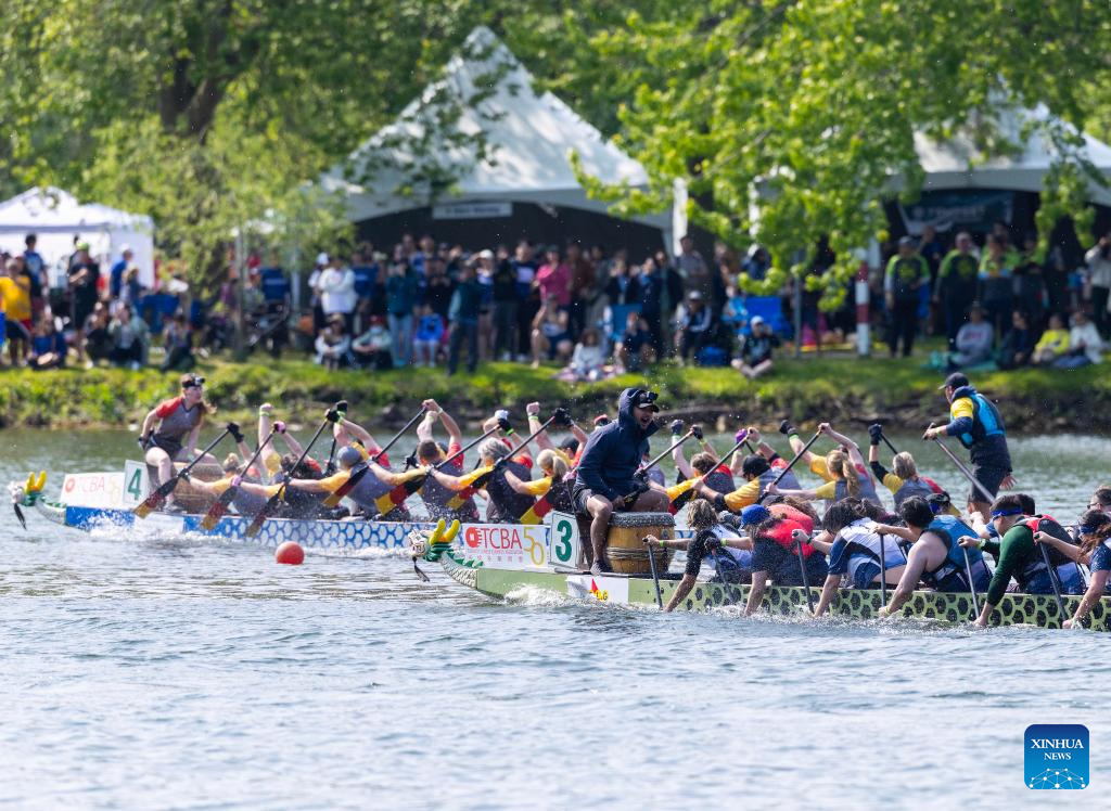 Participants compete during the 2025 Toronto International Dragon Boat Race Festival in Toronto, Canada, on June 14, 2025. (Photo by Zou Zheng/Xinhua)