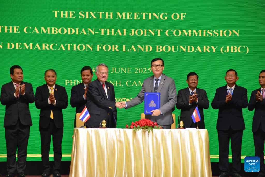Lam Chea (front, R), Cambodian minister in charge of the State Secretariat of Border Affairs and chairman of Cambodia's Joint Boundary Commission (JBC), and Thai Foreign Ministry advisor Prasas Prasasvinitchai (front, L), who is chairman of Thailand's JBC, exchange the agreed minutes of a Cambodia-Thailand JBC meeting in Phnom Penh, Cambodia on June 15, 2025. (Photo by Phearum/Xinhua)