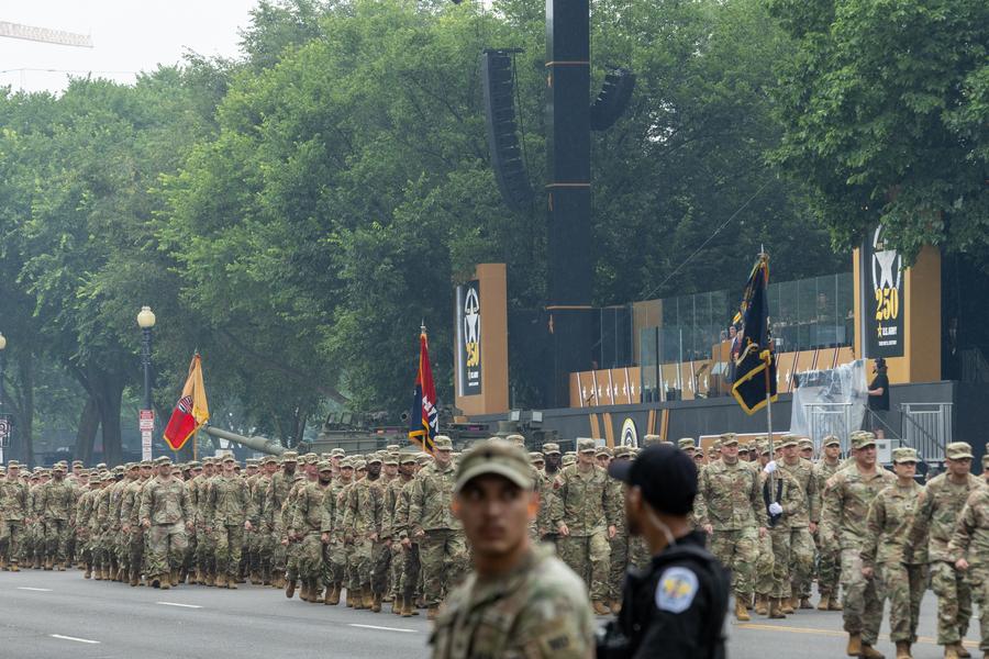NEW YORK, June 15 (Xinhua) -- U.S. President Donald Trump on Saturday hosted a military parade in Washington, D.C. to mark the U.S. Army's 250th anniversary, with all-day events and the participation of over 6,000 soldiers, over 120 vehicles as well as a flyover, at the reported cost of around 45 million U.S. dollars.